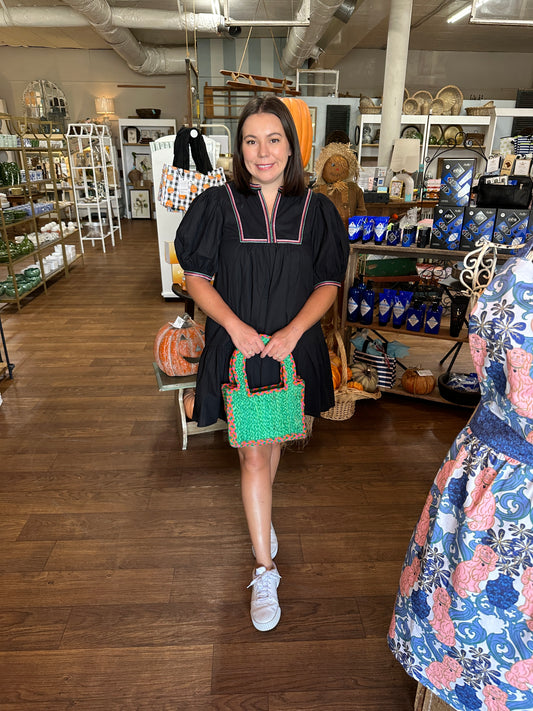 Blue Dress with Green Neckline and Piping on Sleeves