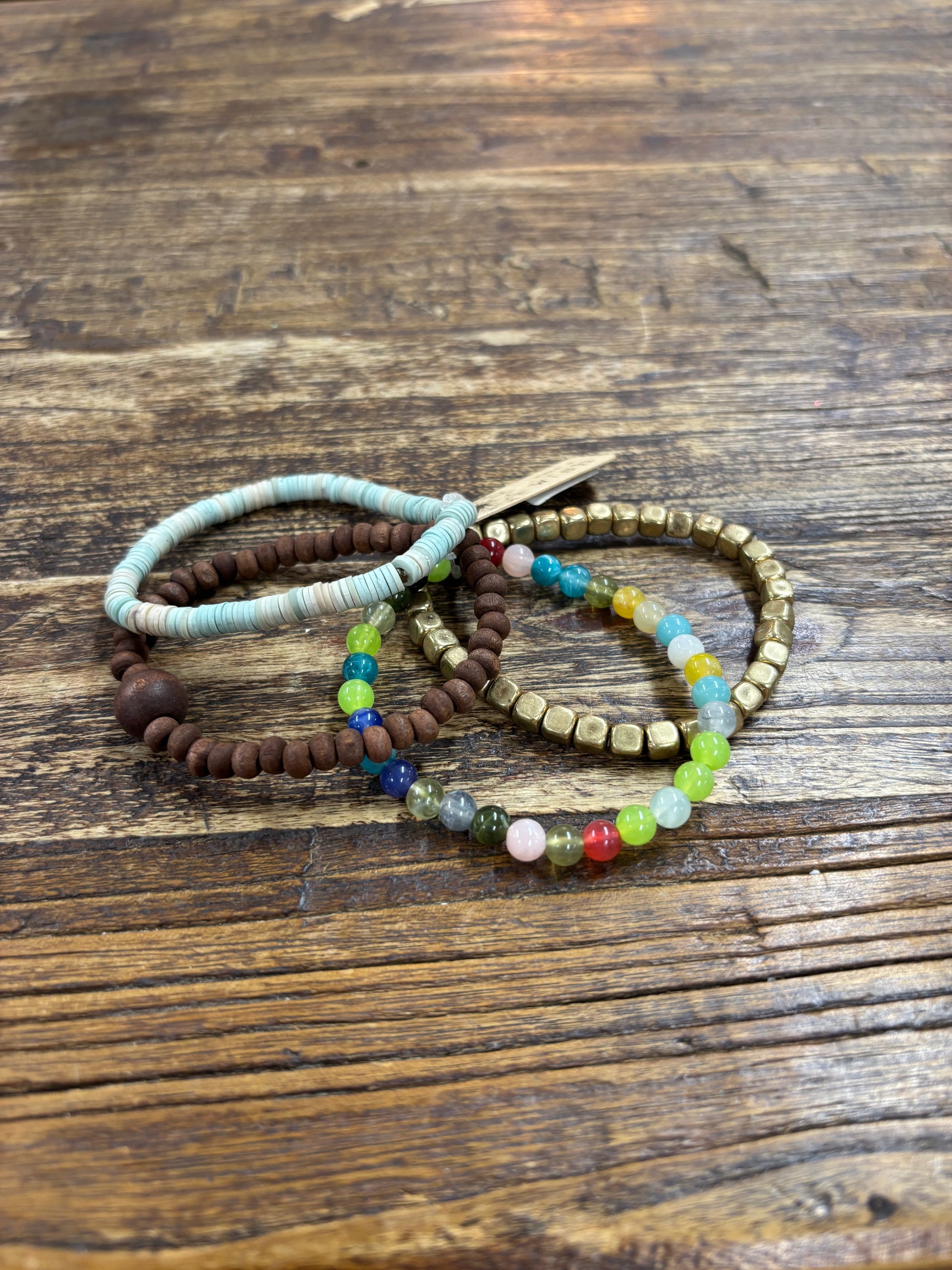 Bring a bohemian touch to any outfit with our 4-piece Boho Bracelet Set. This set includes a gold square beaded bracelet, a brown round beaded bracelet, a multicolor glossy beaded bracelet, and a thin sliced pastel multicolor bracelet. The perfect combination of style and versatility. Stand out with this unique set.
