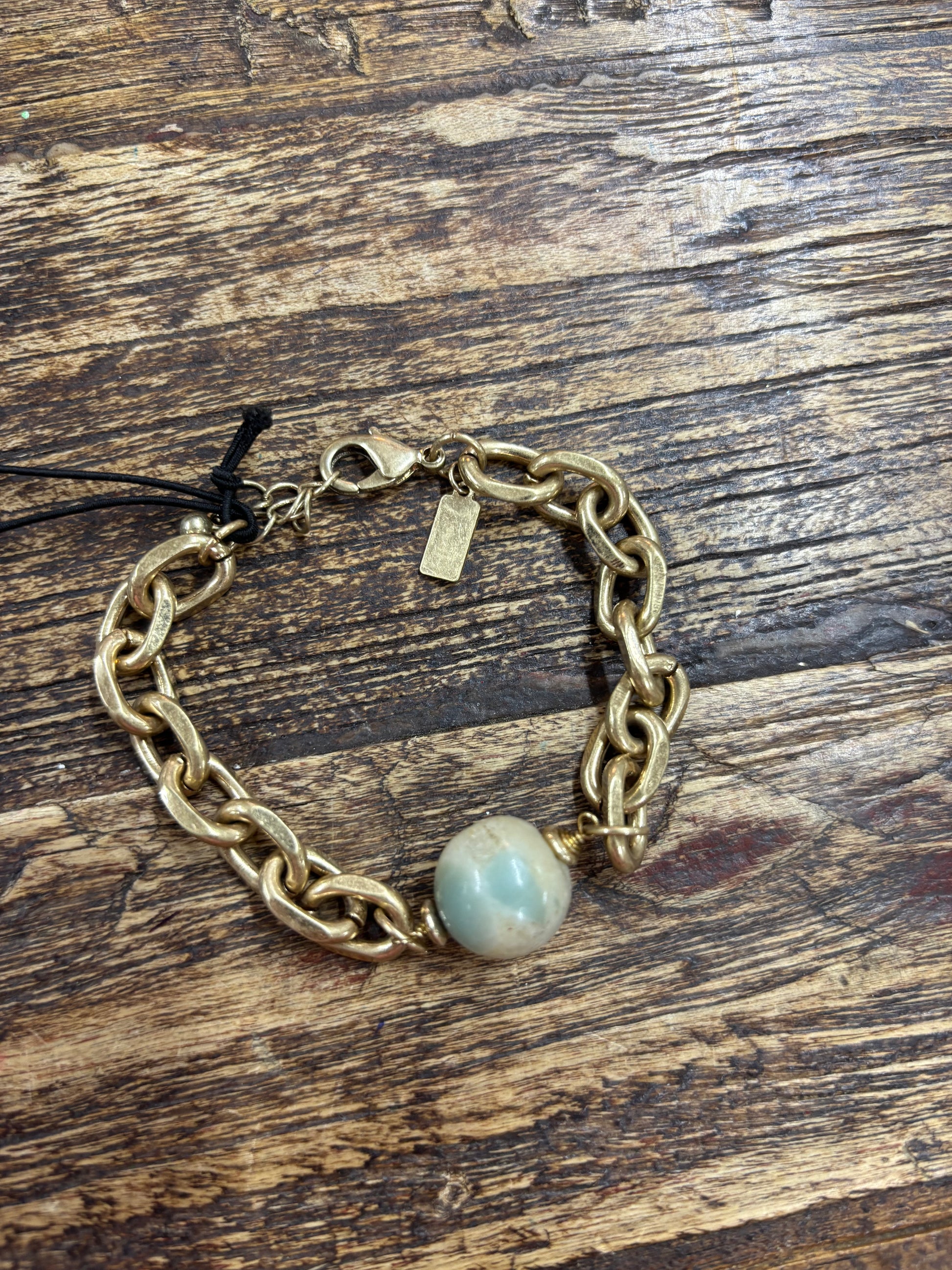 This Canvas Gold Chain Linked Bracelet features a unique turquoise and white ball in the center, adding a cool touch to your outfit. The chain design is both stylish and versatile, perfect for any occasion. Elevate your fashion game with this eye-catching piece.