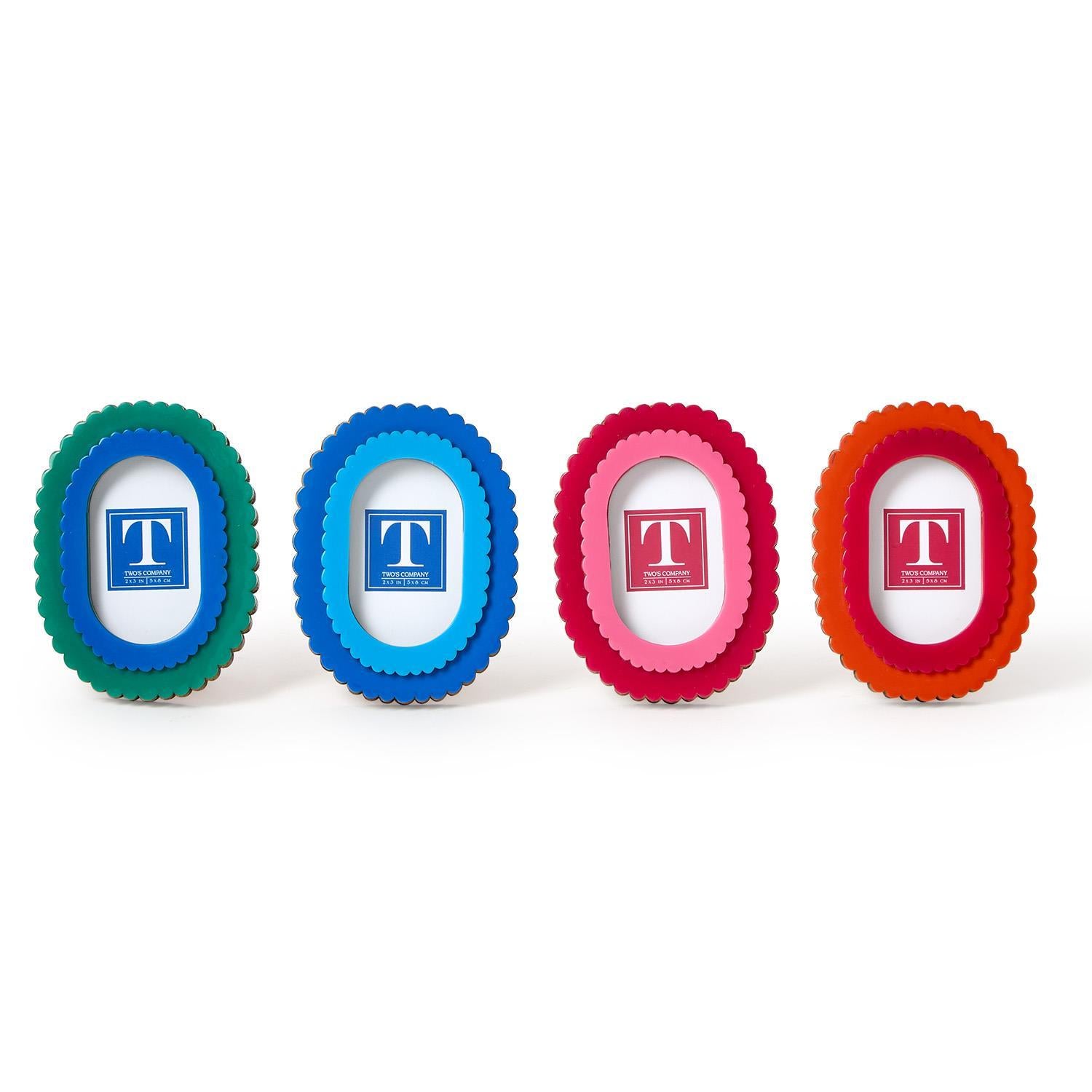 Bring a pop of color and whimsy to your living space with our Double Scalloped Edge 2x3 Photo Frame. Handcrafted with care, this frame comes in four stunning colors - Green, Blue, Pink, and Orange - to perfectly complement any decor style.