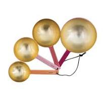 - A set of four enameled stainless steel measuring spoons with colored edges, featuring 1 cup, 1/2 cup, 1/3 cup, and 1/4 cup sizes