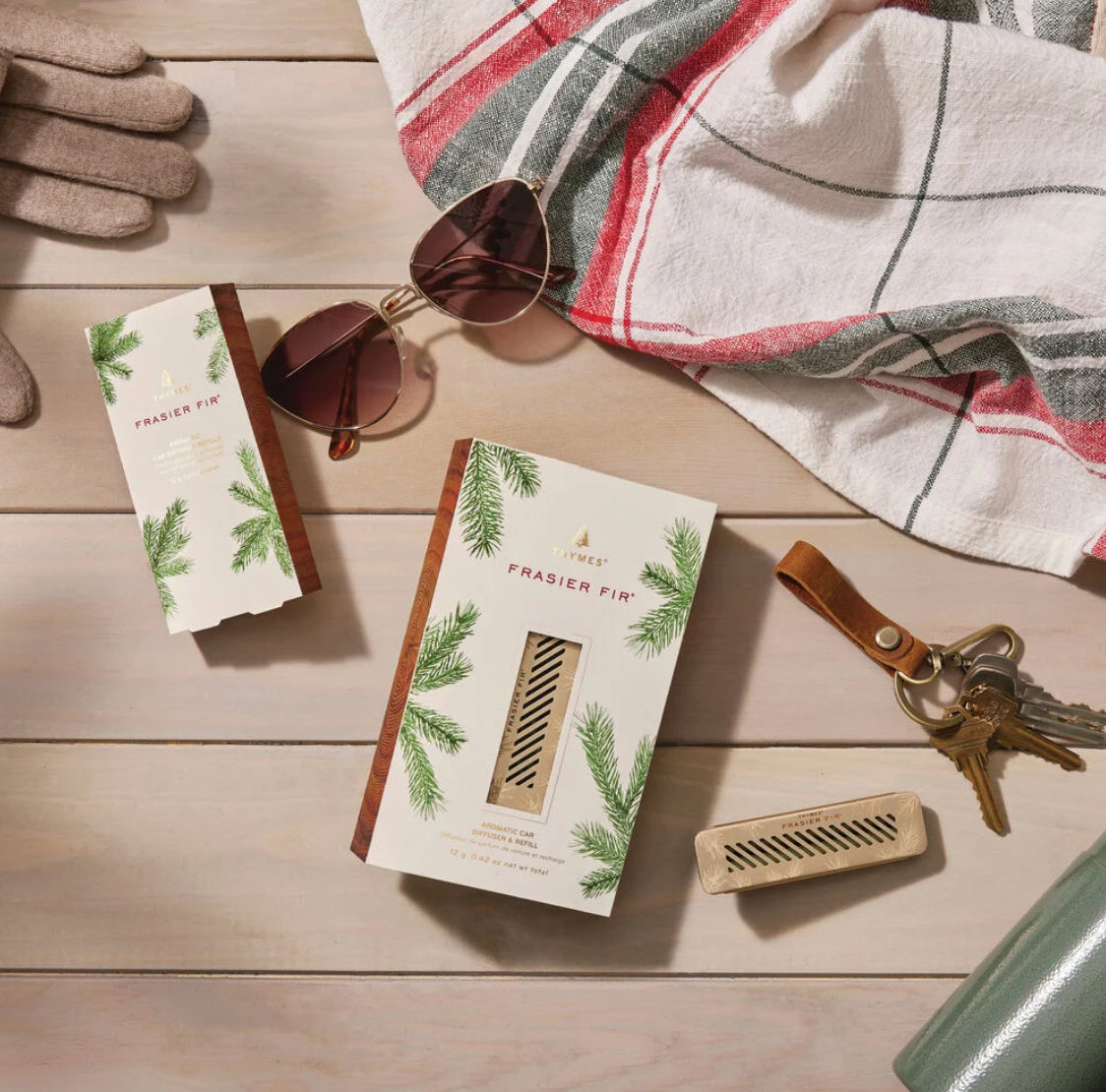 Bring the beloved Frasier Fir fragrance into your vehicle and enjoy the open road with the Frasier Fir Car Diffuser Kit. Complete with a sleek golden plated diffuser and fragrance reeds, simply attach to your vehicle’s vent and fill the air with the just-cut forest fragrance.