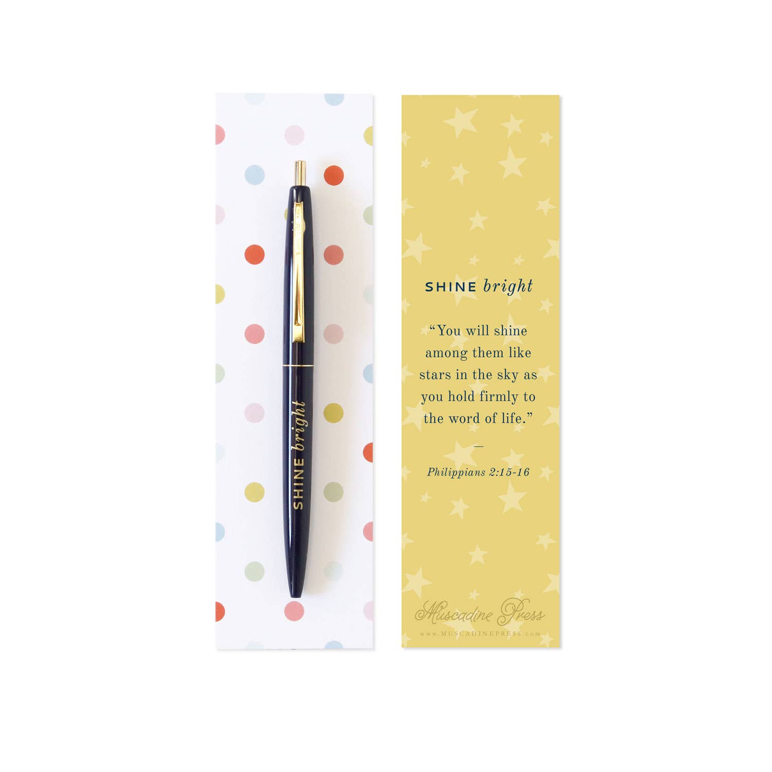 Shine Bright. Our classic ballpoint pens are designed to be sweet reminders of truth in the middle of busy days. This simple navy pen features gold details and a polka dot backer that doubles as a Bible verse bookmark, making it the perfect little gift or happy for the ones who mean the most.