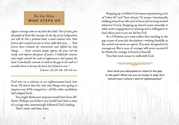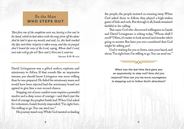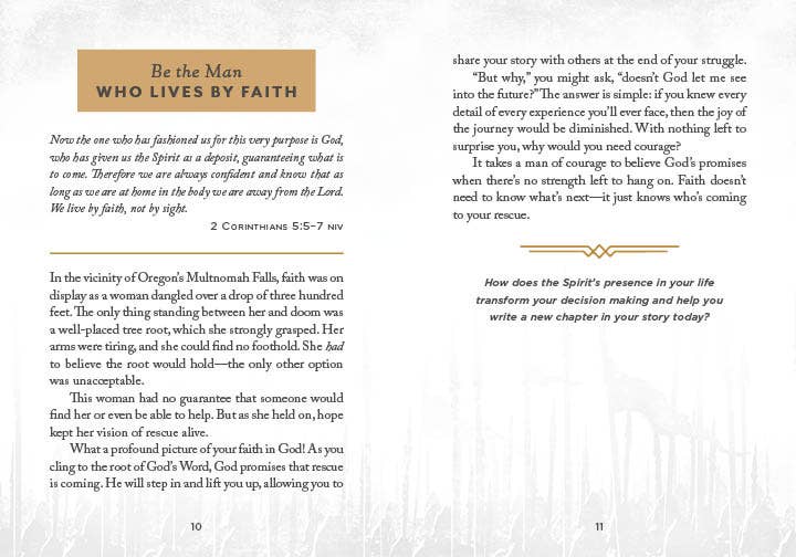 Man of Courage: 100 Devotions for the Fearless Life celebrates men, the ones who pray boldly to God, speak truthfully to culture, and serve sacrificially in their families, churches, and communities. Each entry encourages you to âbe the manââthe man who steps up moves forward humbly resists believes in a miracle follows the King of courage Among dozens of other bold, God-honoring behaviors Youâll be challenged and encouraged to fill your God-given role in your home, your workplace, your community, and your world.