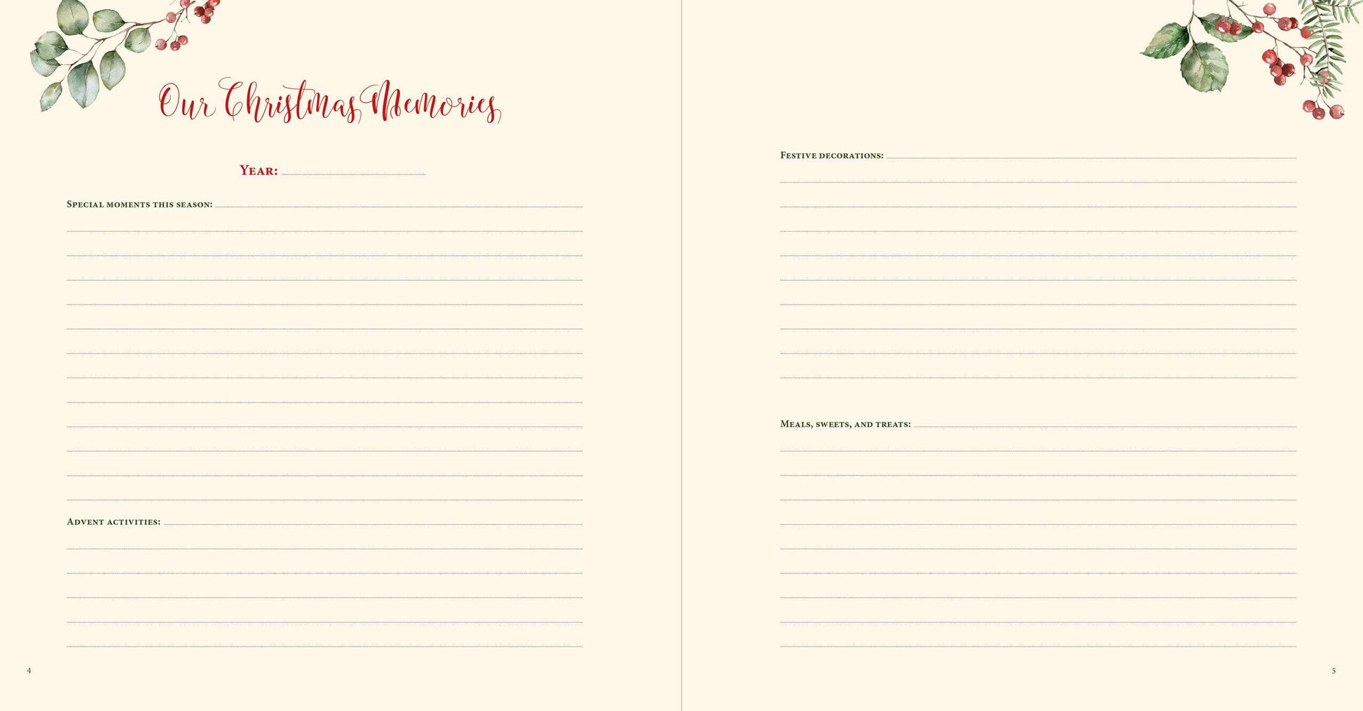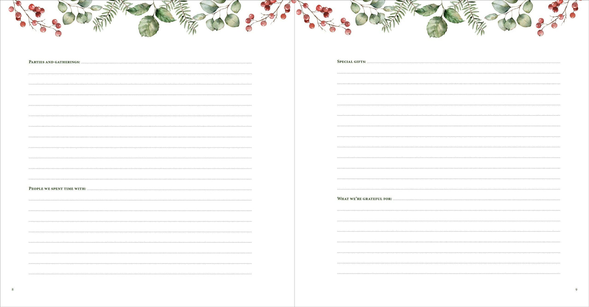 Deluxe Cloth-Covered Edition! Record up to 10 years of Christmas memories in this elegant keepsake album! Beautifully designed pages provide plenty of space to record memories for up to 10 Christmas seasons. Thoughtful prompts allow you to include your family's treasured traditions, favorite celebrations, festive recipes, photos, Christmas cards, and so much more.
