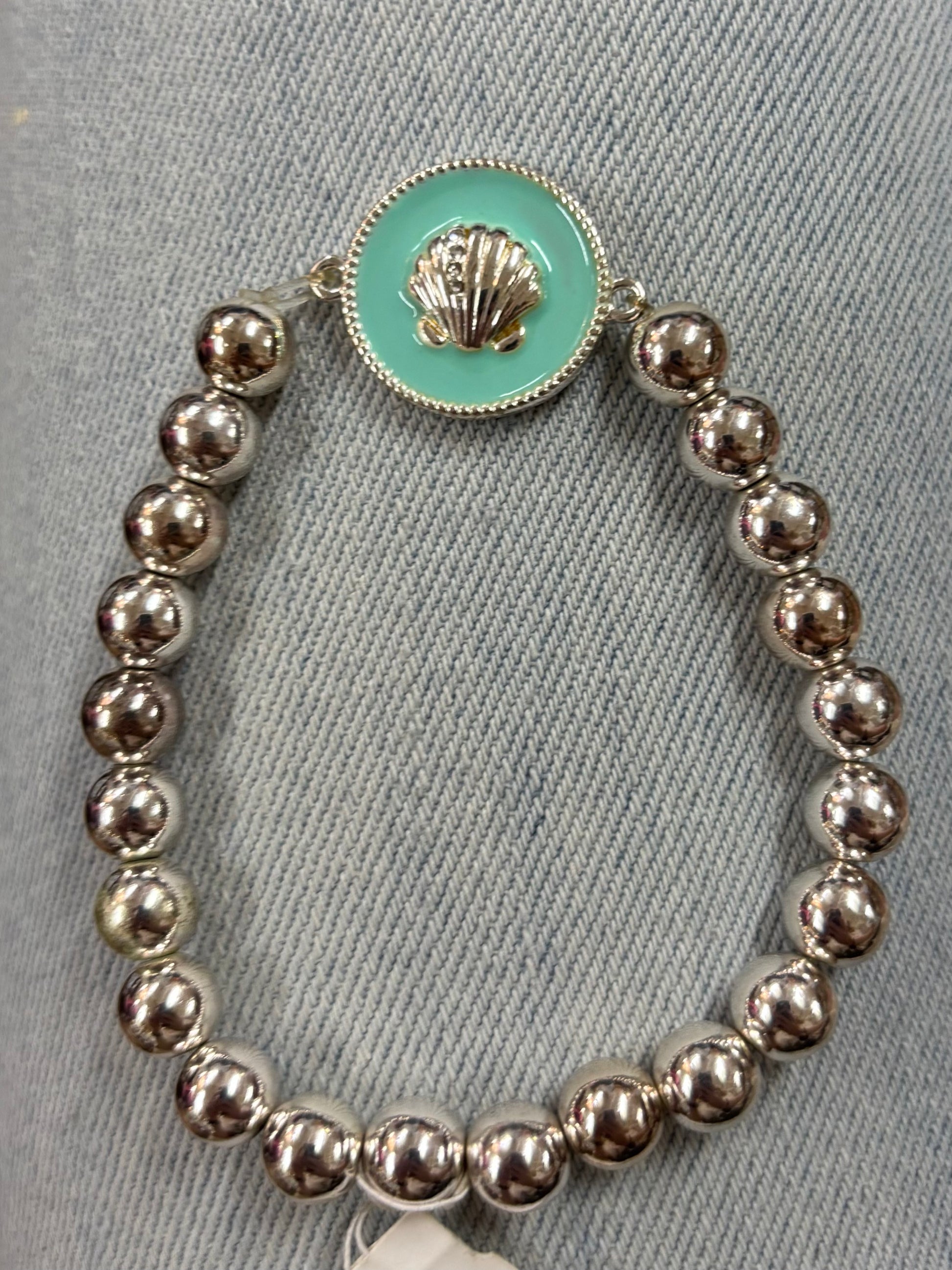 This Silver Beaded Teal Sea Shell Bracelet is expertly crafted with silver beads and accentuated by a charming teal sea shell. Perfect for adding a touch of seaside elegance to any outfit. Made with high-quality materials, this bracelet is durable and stylish.