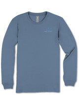 Iceland blue long sleeve shirt with the phrase 'All you need is love and a dog' and two dogs sitting beside a large potted plant. Simply Southern logo below and on left chest. 100% cotton. Unisex sizing