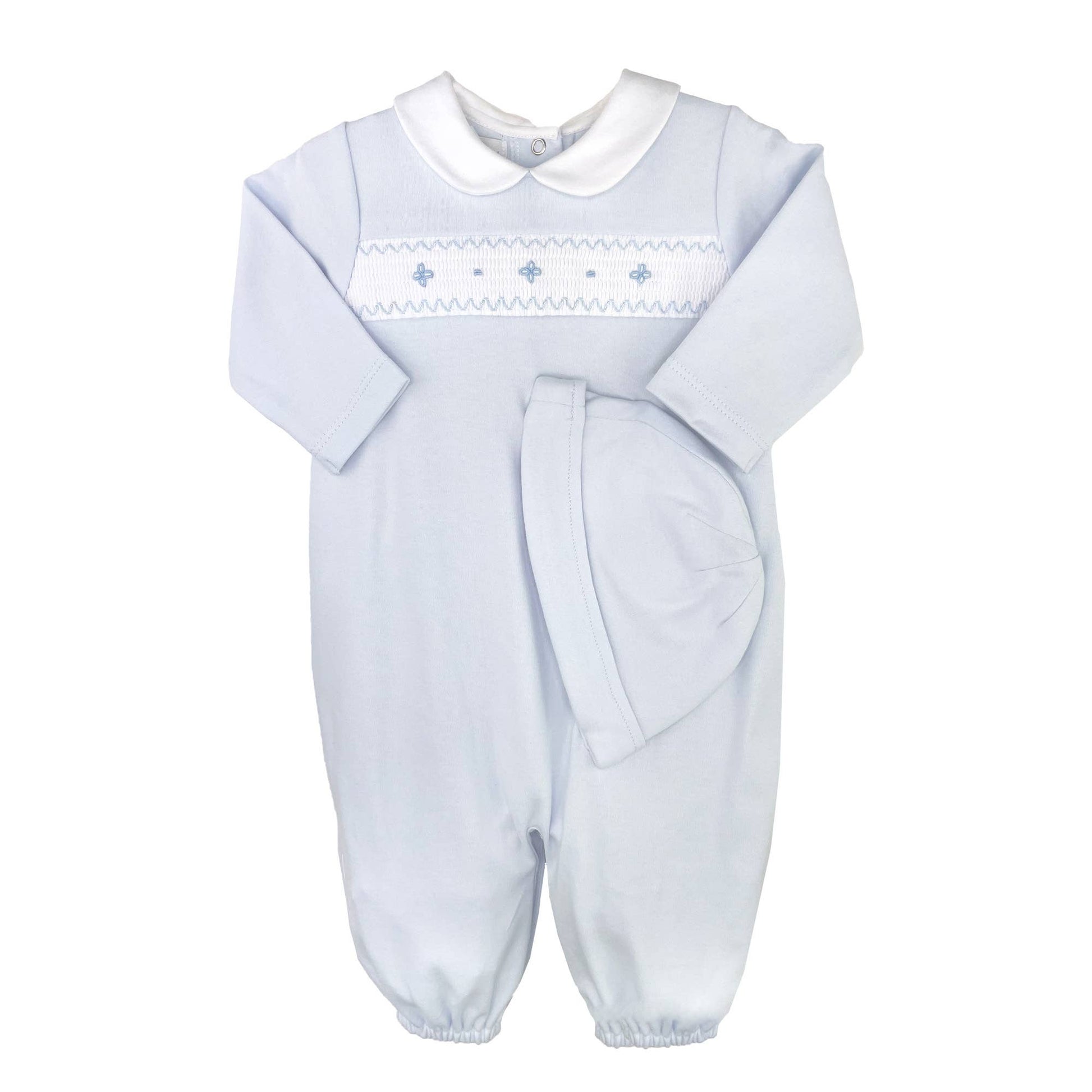 Featuring a delicate light blue and white interlock knit fabric with white center panel with smocking on the front making an outfit that is just simply sweet and perfect for wearing home from the hospital!