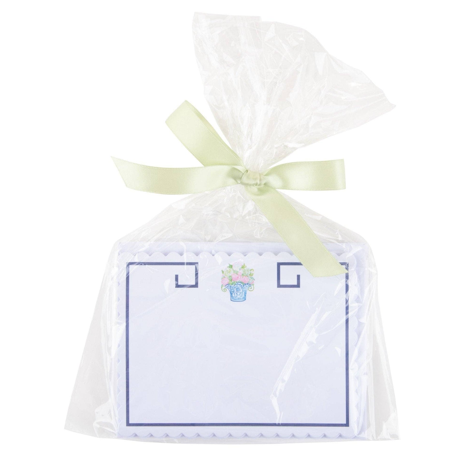 Say thank you with a little Southern charm using our Southern Blooms Flat Notecards! Our flat notecards feature a scalloped edge, 4 hand-painted potted greenery and floral art images and modern border in navy. Envelopes are included with hand-painted art stamped in lower left hand corner. 8 flat notecards and 8 envelopes come neatly packaged in cellophane wrap, tied with a pink satin bow.